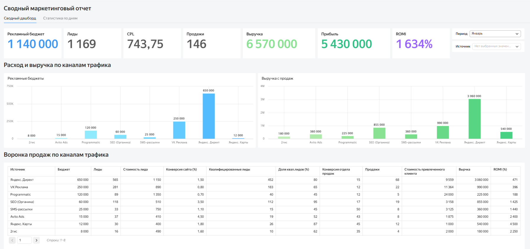 – Наши автоматические дашборды превращают данные из хаоса таблиц и чатов в понятную картину бизнеса, где видно всё — от эффективности каждого отдельного менеджера до окупаемости каналов продвижения.